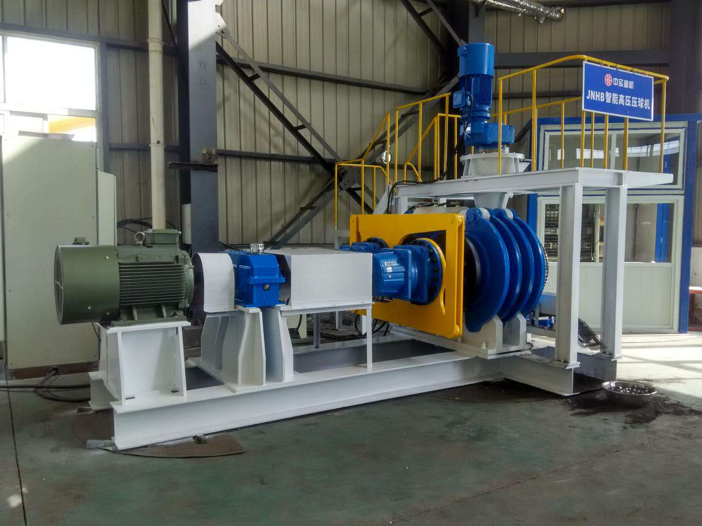 GY high-pressure ball press machine is a kind of pelletizing machine which can feed various kinds of dry and wet powder through the preliminary pressure device compulsorily into the roll press area and make into high bulk density ball. It is mainly applied in the coal, mining, metallurgy, fire-resistant materials, construction materials and other light metal industries. Our company has our own test machine, which can help test the linear pressure of final product, and linear pressure can achieve 300KN/cm.